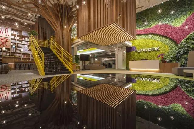 大量原生態(tài)木板、綠植墻的采用使整個(gè)空間接近原生態(tài),營(yíng)造出輕松、休閑的辦公環(huán)境。過去毫無裝飾白色承重柱,也被木制進(jìn)行包裹,演化成了一個(gè)參天大樹,給人大樹底下好乘涼的感覺,樹木象征著生長(zhǎng),萬物欣欣向榮充滿生命力。樹枝向天花板伸展開來,一個(gè)個(gè)樹屋垂掛其中將單調(diào)天花板加入了自然的生氣。