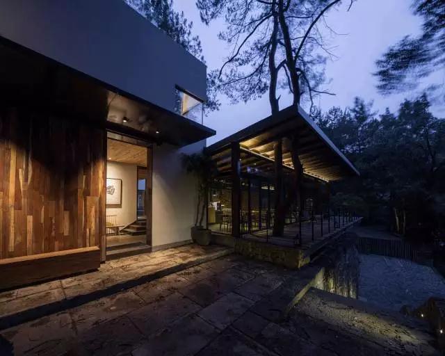 為了強化“禪院”的體驗,“山”的意象也在體驗中被一再提示,不僅進入酒店前需要真實的爬山,一條“游山”的路徑也被設計進了酒店內部:入口及院落被分解在多個標高,爬升行為被有意識地與場所光線的曖昧差別聯系起來。光線被挑檐、水面、柱廊、格柵、天窗等要素仔細控制后,由下至上形成由暗『晦澀』及明『現代』的氛圍轉換,最終在只能看見天與樹冠的屋頂露臺達到明的極致,建筑『人工』從視線中消失。
