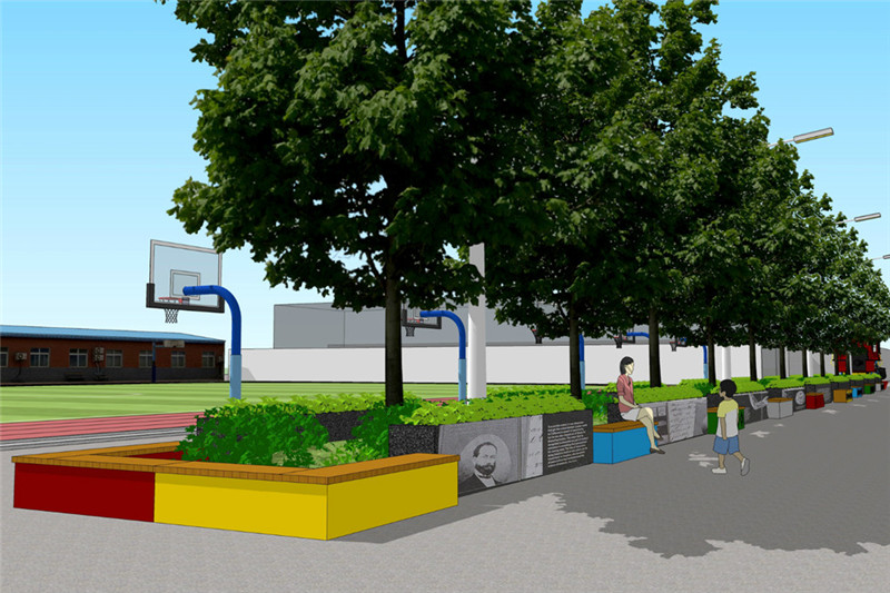 在許多學校,通過植被和其他設施的設計,使圍墻具有宜人的環境,成為學生課后的好去處,具有促進交流提高校園生活質量的作用。