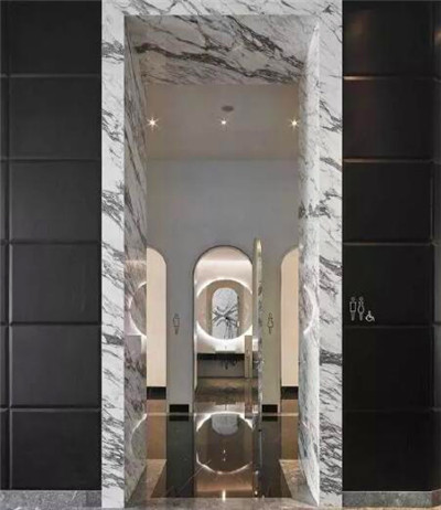 客房的設計打破了常規的設計,尤為鮮明的是浴室與臥室之間的不規則六邊形大理石,這間大理石淋浴房的存在分割了整個客房的規則布局,更是與客房內斜線的細節設計交相呼應。