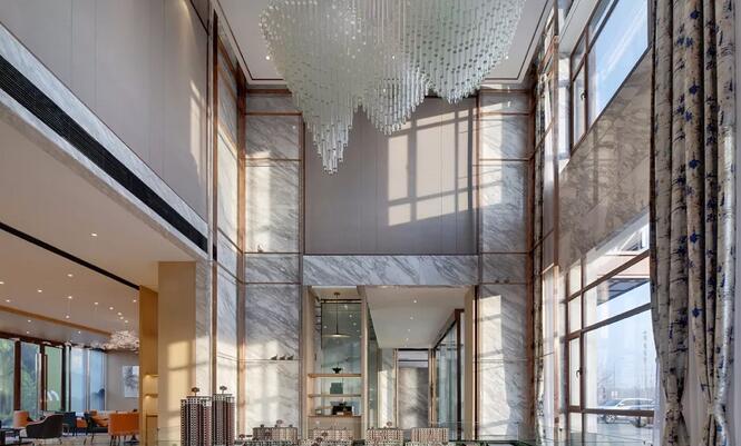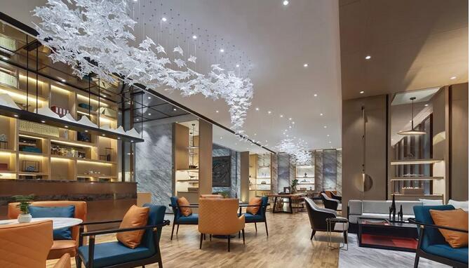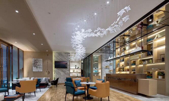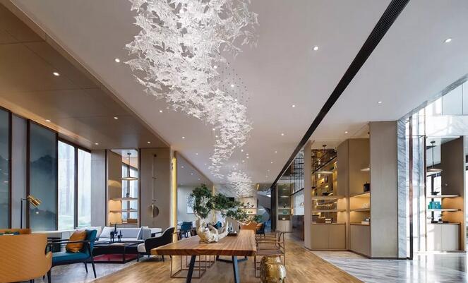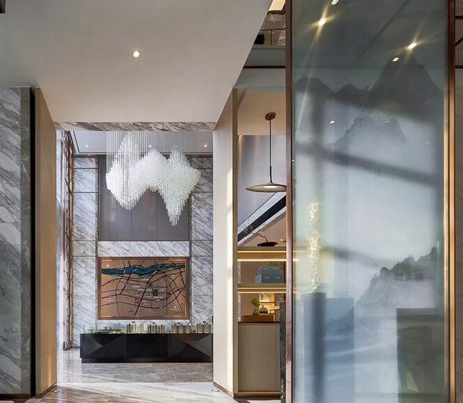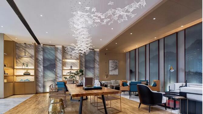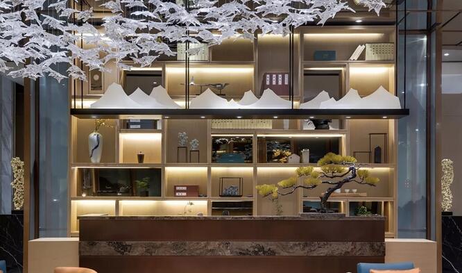 “夫畫道之中,水墨最為上。肇自然之性,成造化之功。”雕塑“墨舞”以濾盡色彩剔透琉璃為墨,飽蘸筆觸,起承轉(zhuǎn)合,縱橫貫穿于洽談區(qū),成了空間最純粹的風(fēng)景。