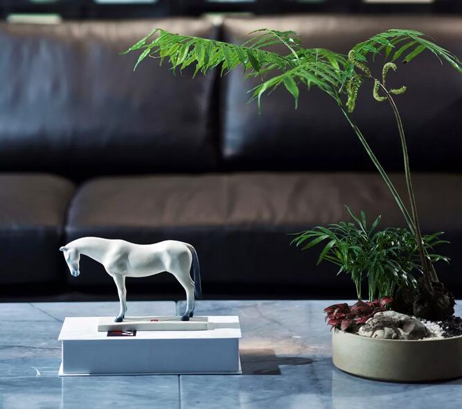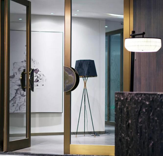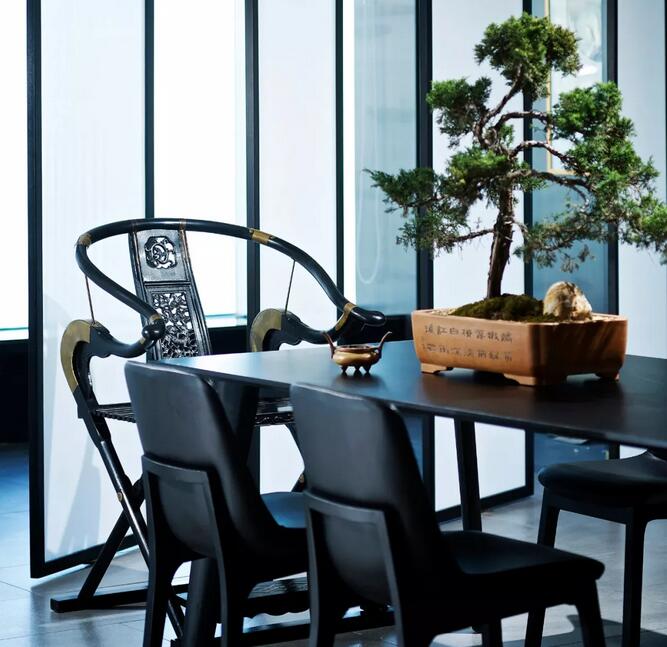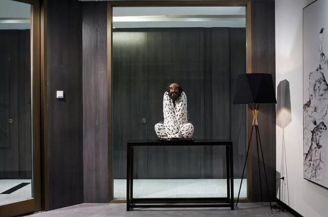 透過(guò)入口玻璃窺探,一幅太湖石畫(huà)映入眼簾,千古名石肌理由蒙古黑燒制而成,引園林意境入室。達(dá)摩的雕塑隱喻了當(dāng)下語(yǔ)境中禪意美學(xué)的回歸。