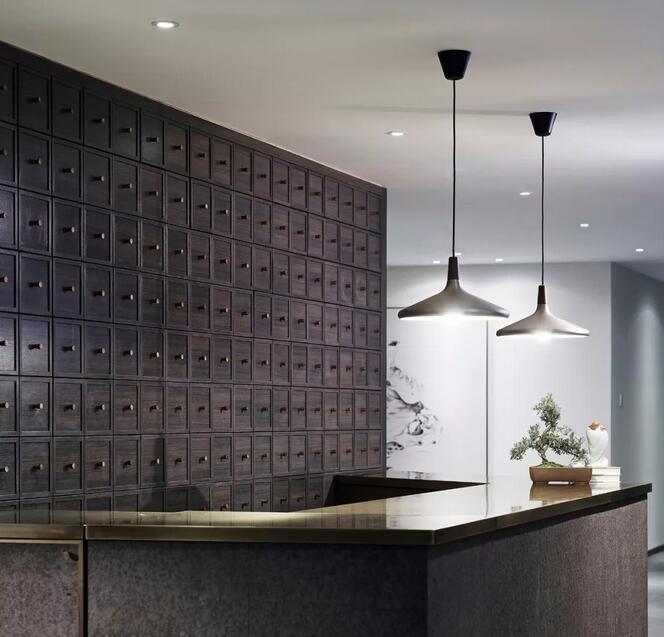 走近前臺(tái),帶有手工溫度的古銅材質(zhì)被用于中式藥柜臺(tái)面以彰顯高貴感。明暗交錯(cuò)的長(zhǎng)方形大理石磚,喚起小時(shí)候下雨過(guò)后地面將明將暗、半干未干的記憶。