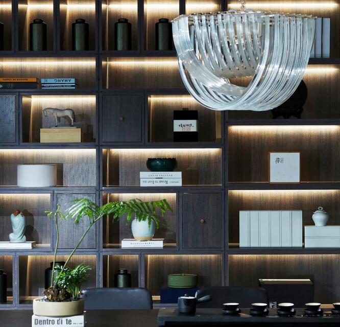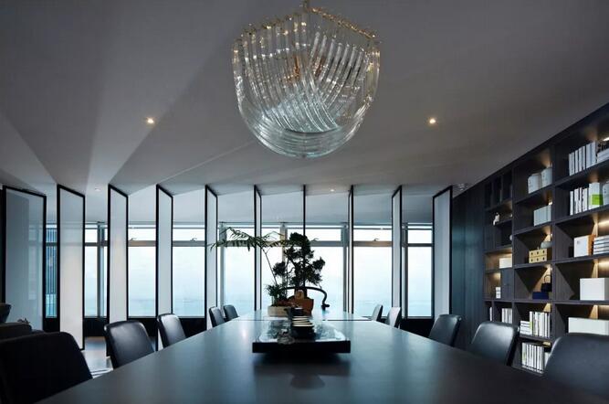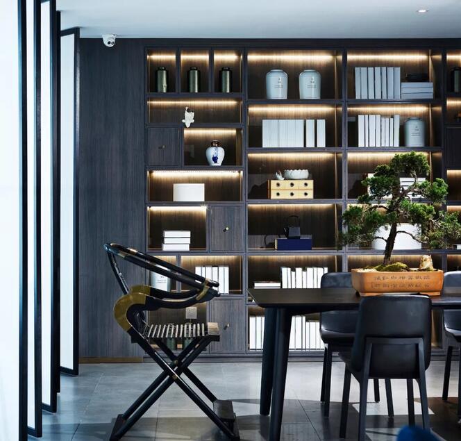 休閑區(qū)內(nèi),一株松柏透出骨子里濃濃的文人趣味,屏風(fēng)之后又是海納百川的廣闊胸懷。空間中的新中式書(shū)架以及皮質(zhì)沙發(fā)通常服務(wù)于成功男性,設(shè)計(jì)師將傳統(tǒng)交椅的小尺度改為大比例,為舒適加分,觀賞海景的同時(shí)帶來(lái)君臨天下的會(huì)談體驗(yàn)。