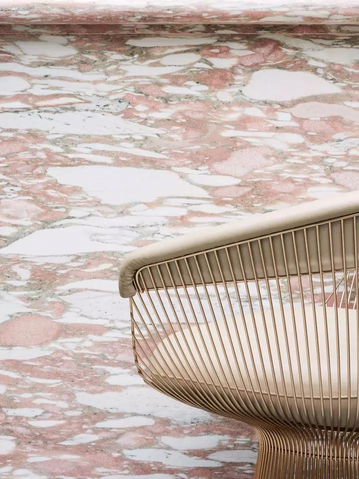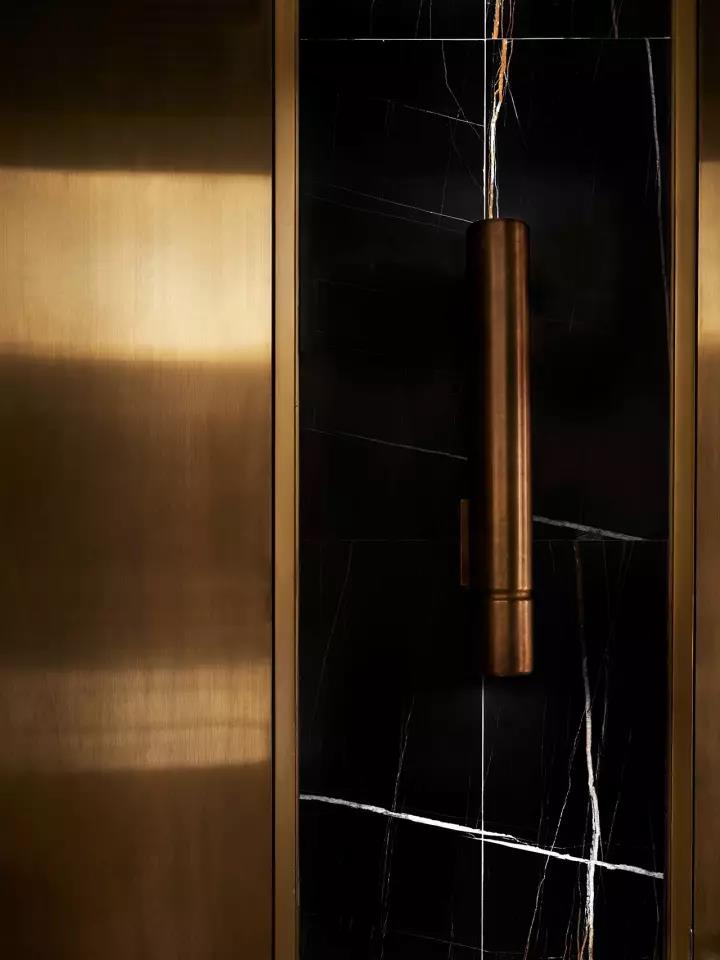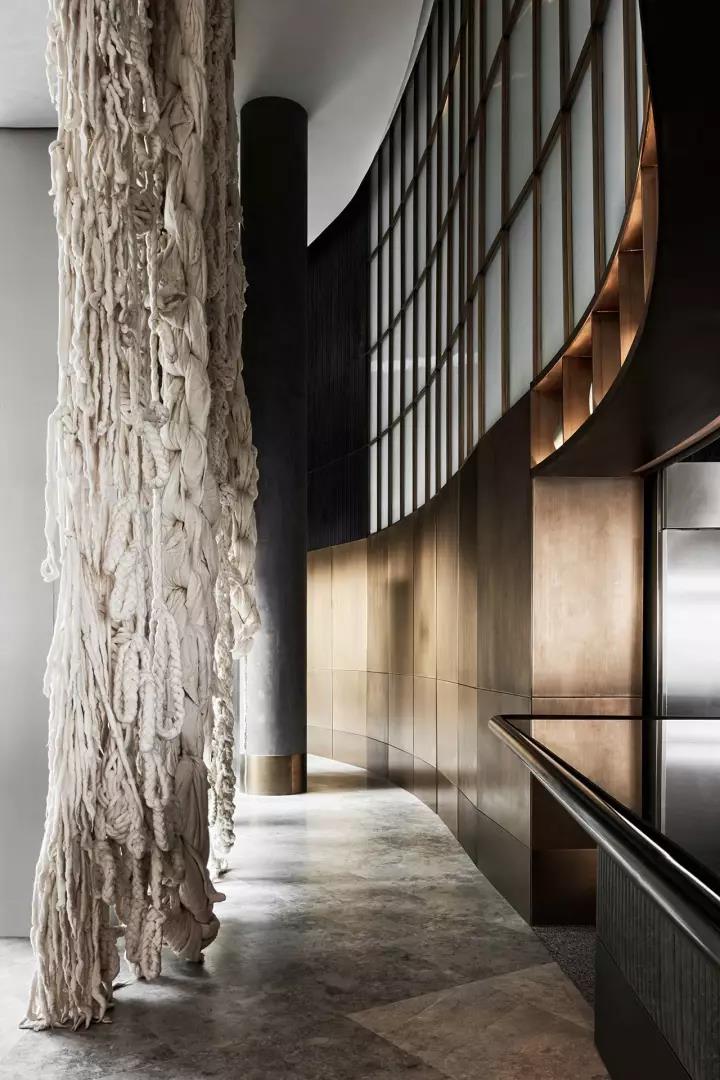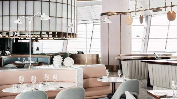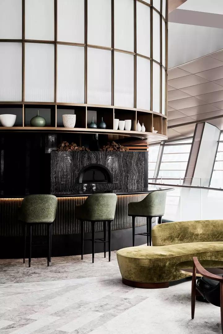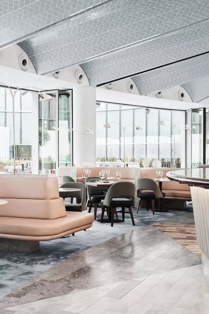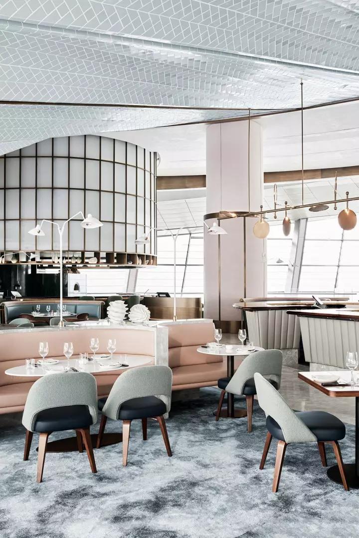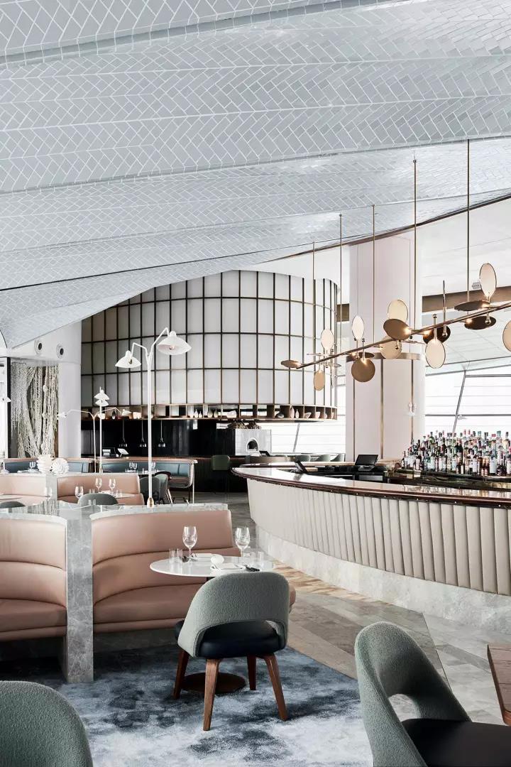 餐廳的設(shè)計從迪拜歌劇院和主廚對生蠔的熱愛中獲取靈感。在主餐廳里,一種粉色和奶油色的皮革和淺灰色的大理石色調(diào),類似生蠔內(nèi)部,而外圍則有一系列深色的灰色、綠色和黑色的色調(diào),讓人想起生蠔殼風(fēng)化紋理。貼著瓷磚的拱形天花板類似海上的波浪,加強了海洋主題的設(shè)計理念,手工制作的藍(lán)色羊毛地毯,是Alexander & Co特別設(shè)計來模擬海洋水域。