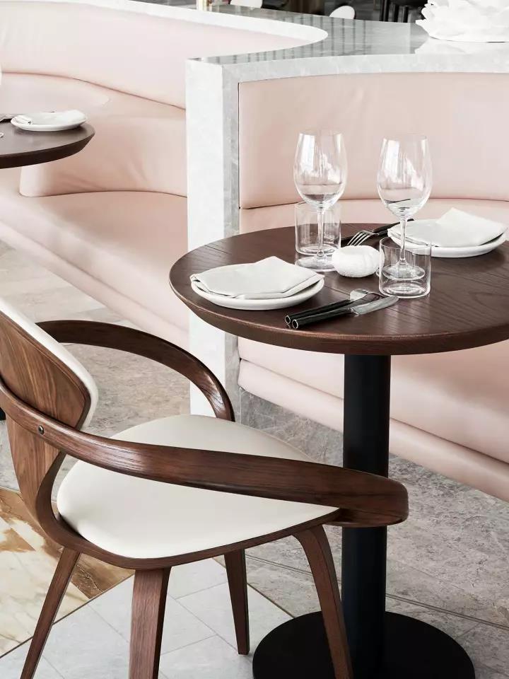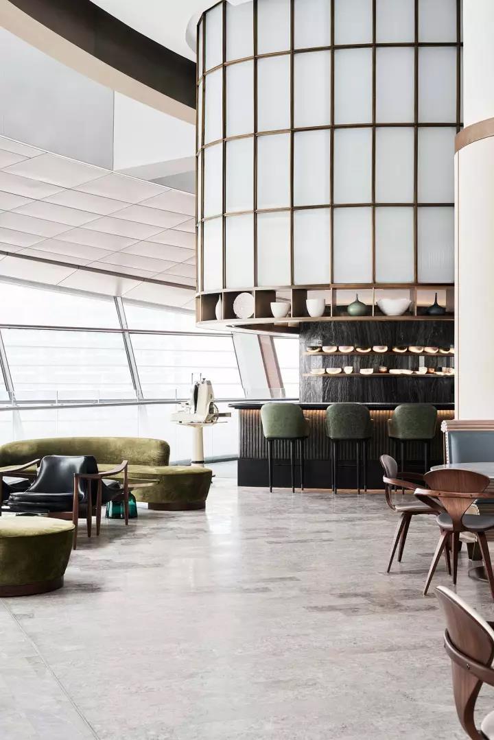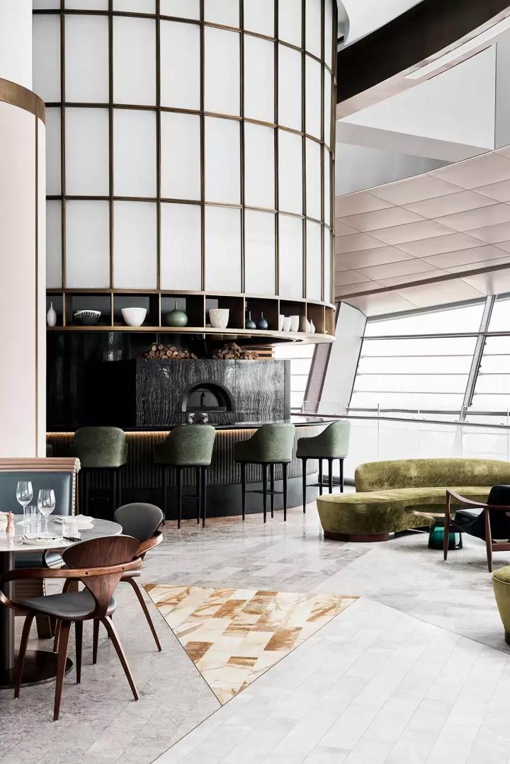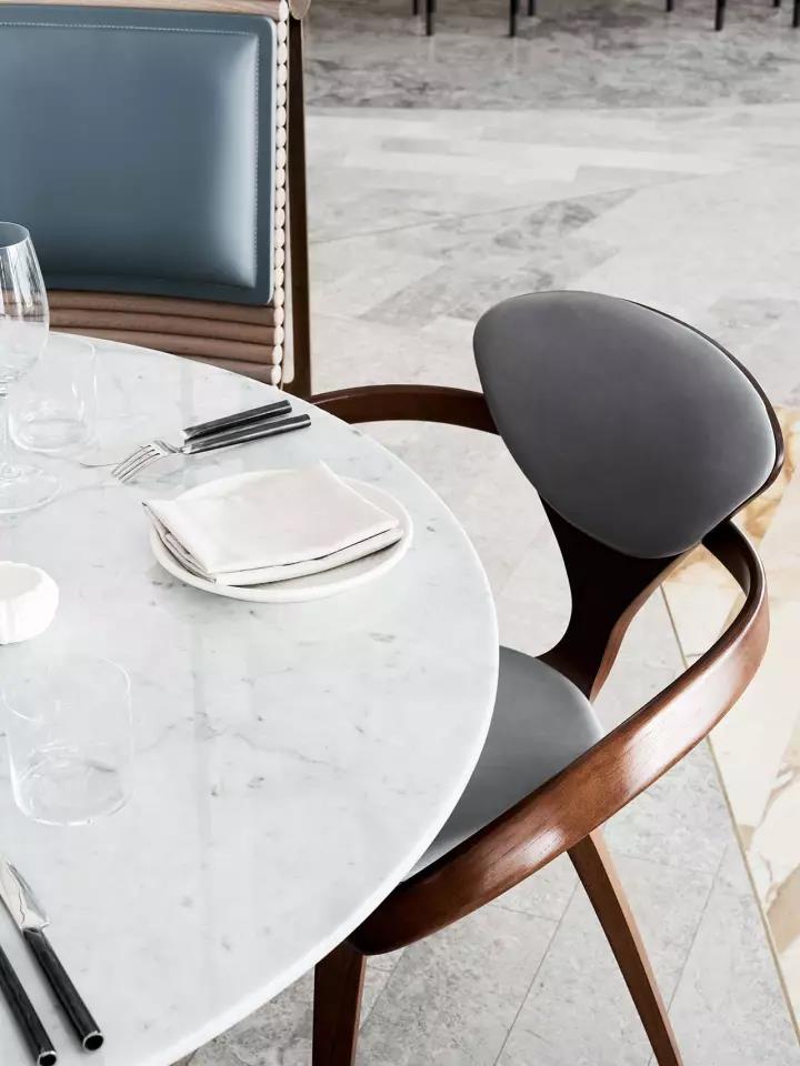 布藝部分使用綠色、灰色、藍(lán)色和白色的皮革面料傳遞強烈的海洋氣息,搭配中世紀(jì)天然的胡桃木家具,Serge Mouille的蜘蛛臂落地?zé)簟J拐麄€餐廳猶如一顆珍珠般璀璨耀眼。