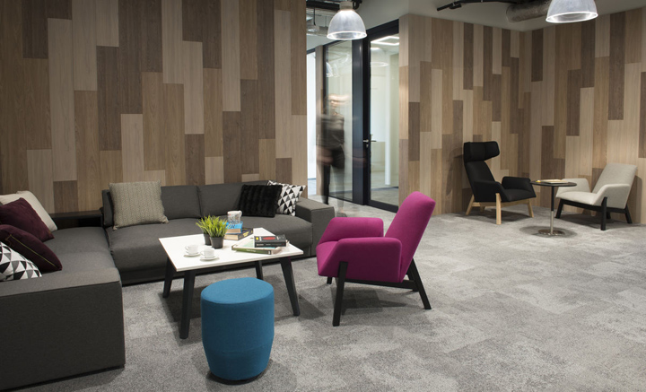 開放空間和輔助空間(文印室、茶水區、付費電話會議室、電話亭等)圍繞一處大型開放的廚房咖吧而設。黑色方管制作的展示架兼具實用和裝飾性,帶來強烈的工業美學特征。