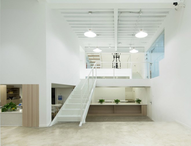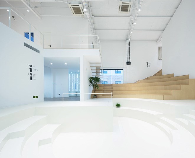 整個設計在保留長方形廠房的基礎上,建筑室內空間輪廓放棄了長方形的限制,建筑室內標高也不再是單一水平,而是功能的分化設置不同區域的標高,通過室內階梯與坡道相互連接。廠房東邊做了兩層標高,一層入口區為形象宣傳,臨近南立面是一個長廊,一半作為電影海報展示,另外一半為微縮景觀。外墻鏤空花磚形式,陽光透過外墻照射到展示長廊。二層為獨立創作空間與兩個創始人工作室。廠房西邊利用層高做了多個標高,從一至四層以及之間的夾層與錯層空間,容納了開敞通透的圖書室,封閉的觀影室,健身房、淋浴室、半地下(負一米)廚房、聚餐和party空間,也有加班可以休息的睡眠空間。