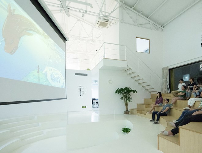 動畫片制作特殊的工作流程,分為前期中期后期三部分。前期制作需要相對自由的氛圍,能帶動創新思考的舒適空間。中期制作作為工作主體,對空間的靈活性和開闊性較有要求。而后期制作則要求嚴格控制光線進入空間內部。彼岸天團隊由創業,發展到現在形成以年輕人為主的一個大家庭氛圍,有自己的廚師,員工晚上有時會加班睡在工作室里。根據這三個不同工作目標的團體的需求,建筑師在這個空曠的方盒子內進行重新規劃,在整個大的空間里面限定出眾多圍和與半圍和的室內空間,以滿足不同的使用需求。