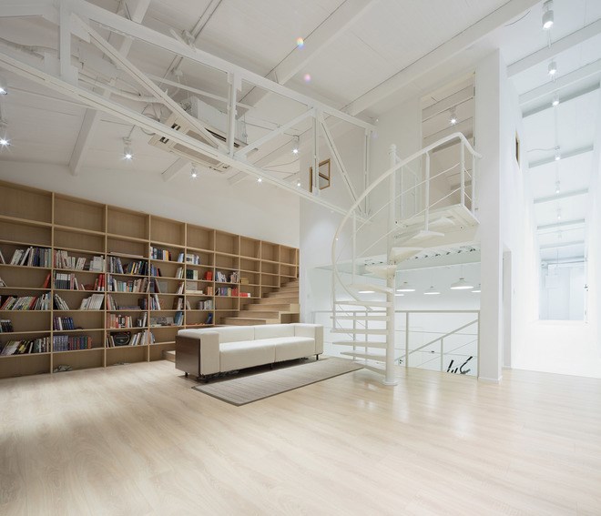 整個廠房建筑層高利用達到極致,并且外立面開窗和室內功能相互對應。整個立面的開窗對應室內不同的標高空間,將建筑內部的活動與功能映射到建筑外表之上,晚上從墻外看到的是室內是帶有場景化的節奏感。整個空間節奏張弛有度,從極其開敞的中庭空間到極其有圍合感的影音室,再到半開敞的圖書閱讀空間,在這個新的建筑里電影人既能通過各種路徑到達屬于所有人的集體空間,又能尋找到屬于自己的獨立小天地,讓工作室變成一個具有場景敘事感的空間舞臺。