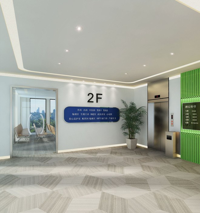 貴陽愛維艾夫婦產科醫院,該醫院空間面積達8000M2,空間設計主要結合企業文化進行更好的闡述,企業的標準色主要分藍色和綠色。